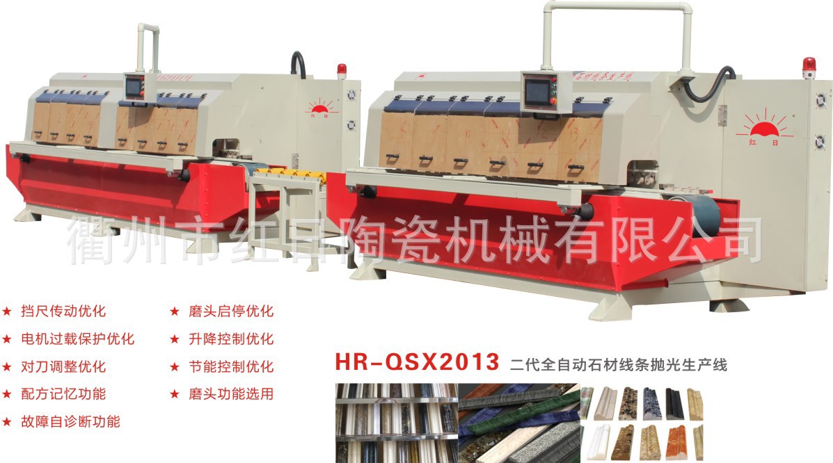 紅日牌全自動線條生產線是我廠在多年制造石材機械和陶瓷機械的豐富經驗基礎上,改良研制出來的陶瓷和石材深加工機械。適用于陶瓷、大理石、花崗石等不同材料,在可設定程序的微機協助下,全自動生產各種形狀的裝飾線條。相對于傳統的手工或半機械加工方式,取得突破性的提高,具有生產效率高、產品質量好、加工成本低等許多新優勢。